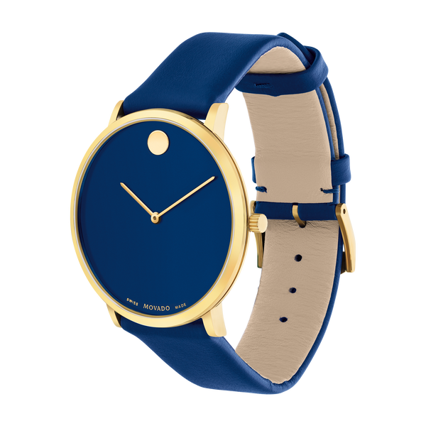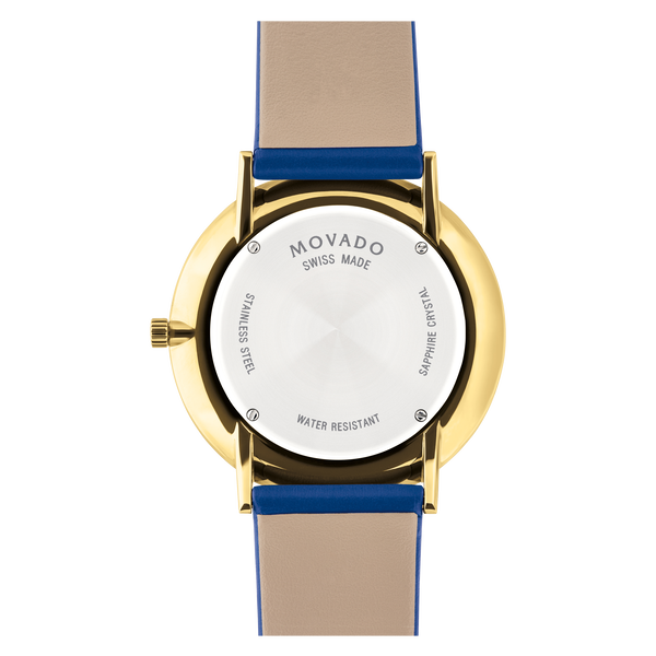 Reloj Movado Modern 47. Con caja en acero 316L de 40mm con acabado PVD dorado. El cuadrante “Museum” color azul, cuenta con el característico punto a las 12 de color dorado y plano. Las agujas tipo bastón también en acabado dorado, son delicadamente minimalistas. La correa es de piel de becerro con tinte azul. Cristal de zafiro y movimiento cuarzo suizo.